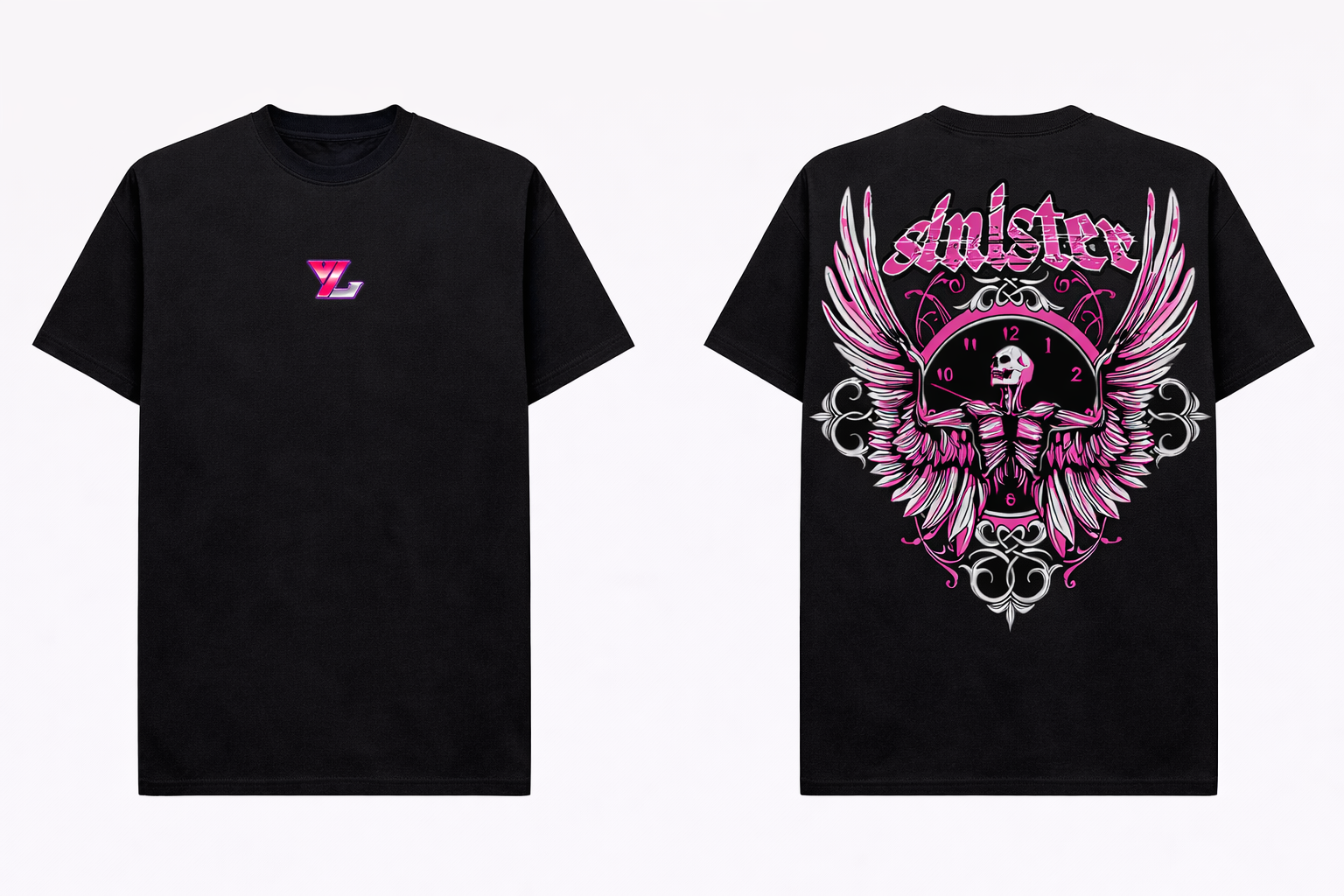 La Sinister Time Tee – Black mezcla arte oscuro y streetwear moderno. Su ilustración trasera con calavera alada y reloj simboliza el tiempo, la rebeldía y la actitud sin límites. Al frente, el logo YL en tamaño minimal mantiene el balance perfecto entre impacto y estilo limpio.